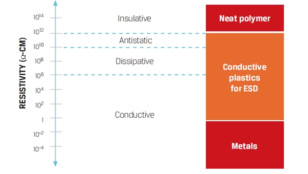 Resistivity of conductive plastic compound generally between 10E+3 and 10E+6 ohms per square. No initial charges, provides path for charge to bleed off. Usually carbon-particle or carbon-fiber filled throughout.